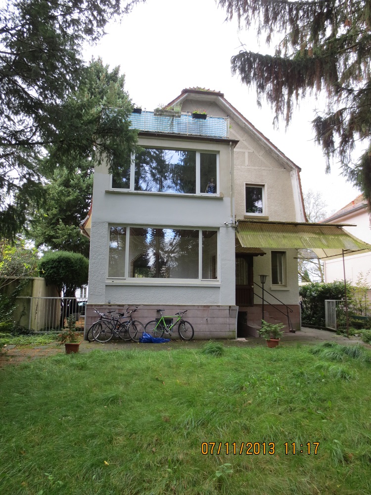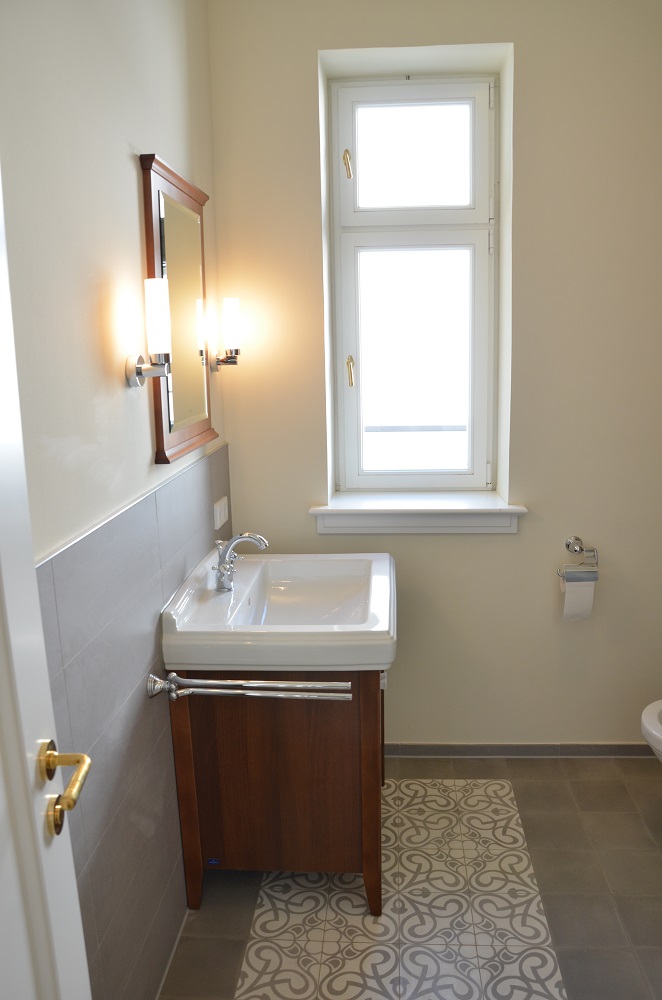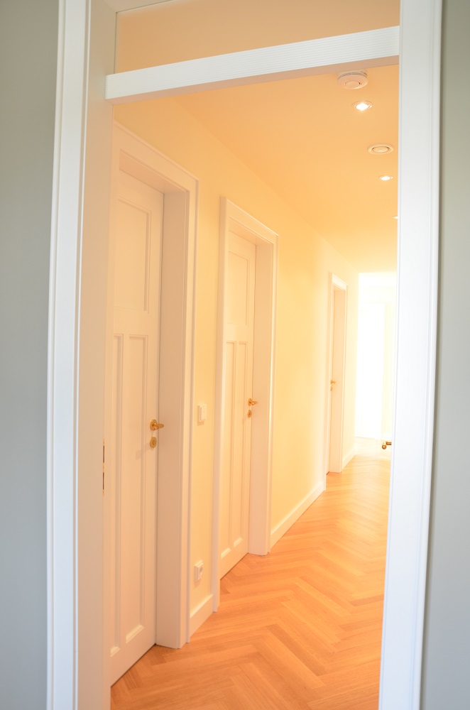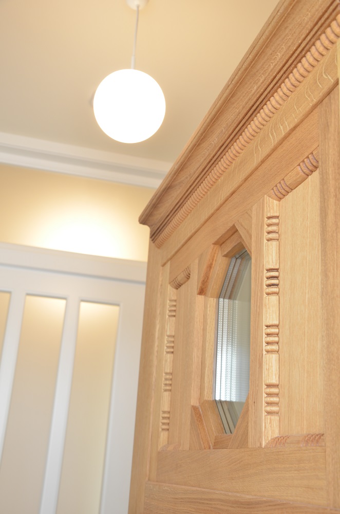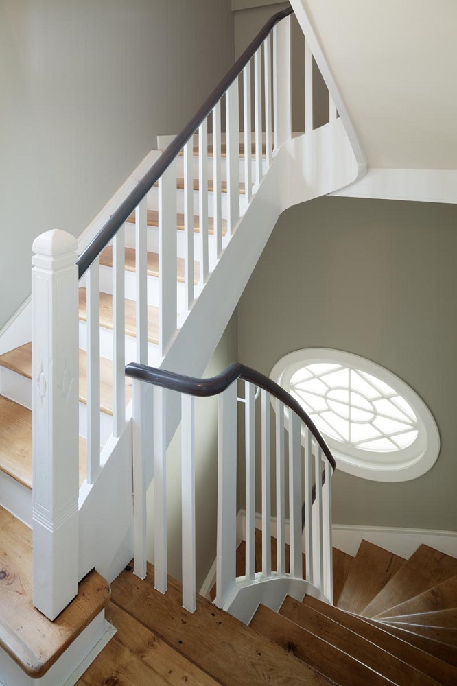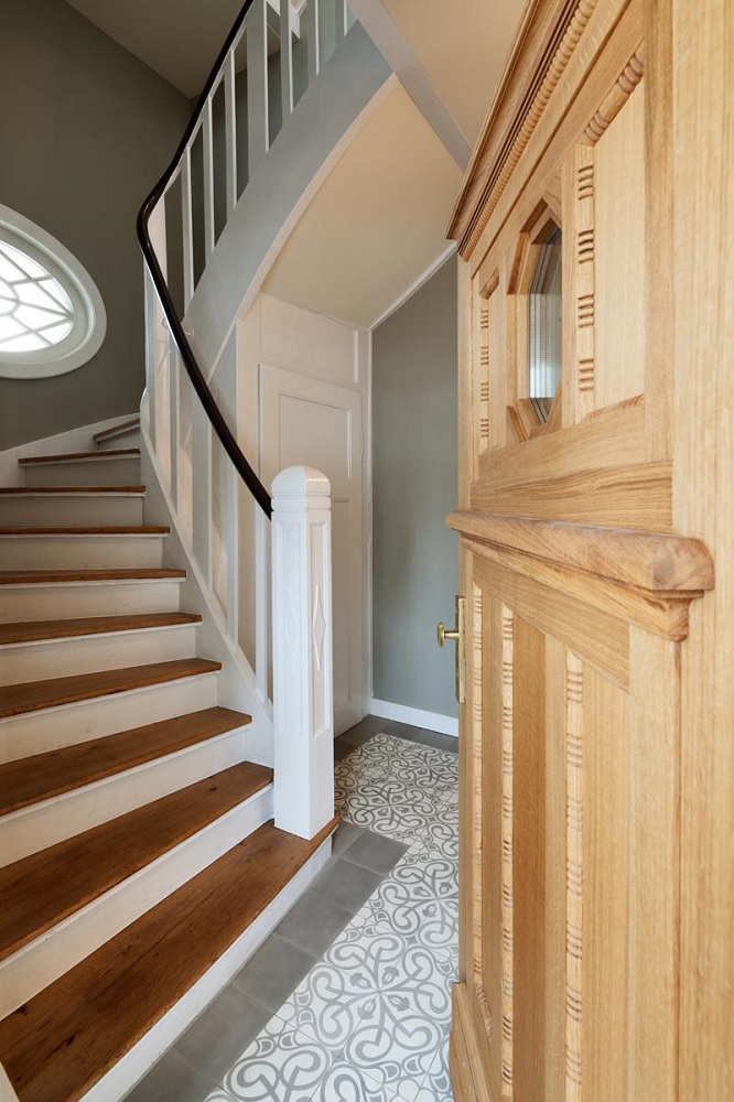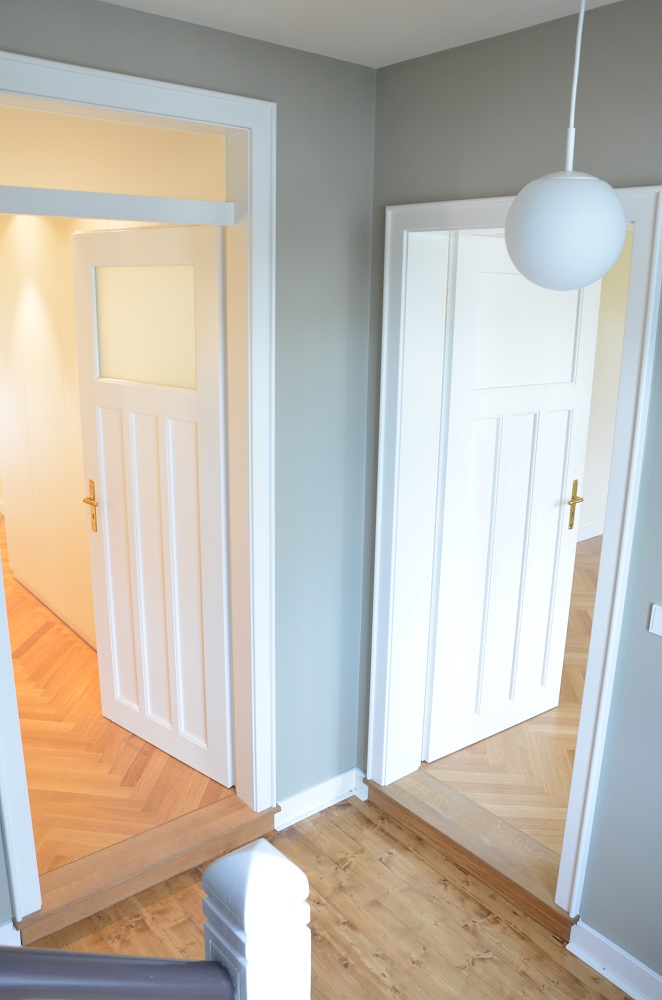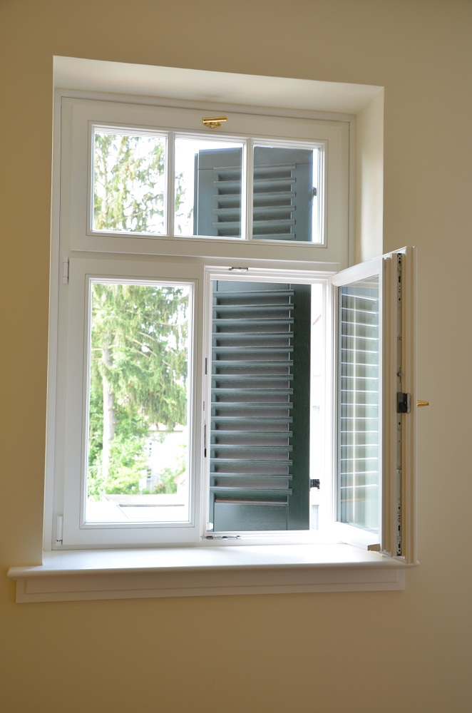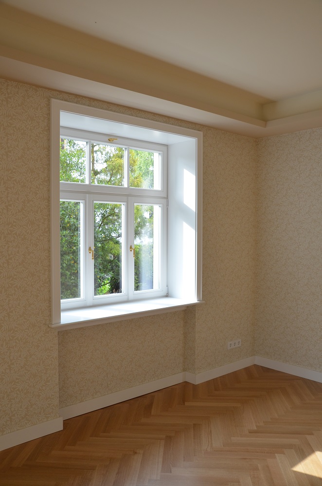 Anhand von zwei letzten erhaltenen Fenstern konnte die ursprüngliche Aufteilung der Sprossenfenster mit Holzklappläden rekonstruiert werden. In aufwendiger Detailarbeit am 1:1 Modell gelang es auch, das Oval im Treppenhaus in identischer Proportion in die Zukunft zu retten: mit 3-fach-Verglasung! Denn der Stand von 1927 (Einfachverglasung) konnte nicht das Ziel sein. Das gesamte Ensemble erreicht das KfW-Effizienzhaus-70-Niveau und übertrifft damit den aktuellen Baustandard deutlich. Dank akribischer Detailplanung und Baubegleitung konnte die ursprüngliche Proportion und das historische Erscheinungsbild mit filigraner Dachkante trotz erhöhtem Dämmstandard wiederhergestellt werden.
