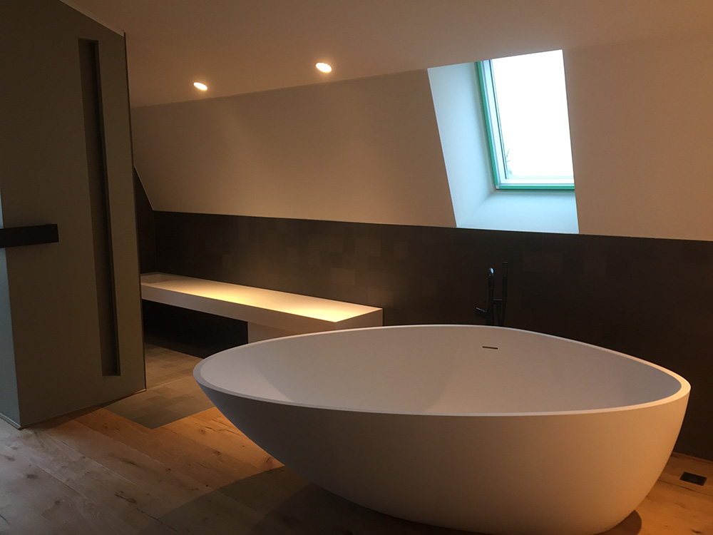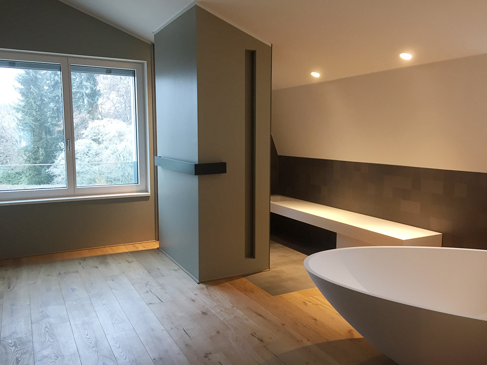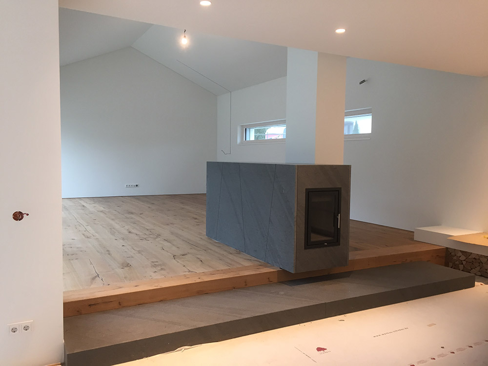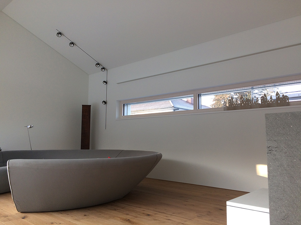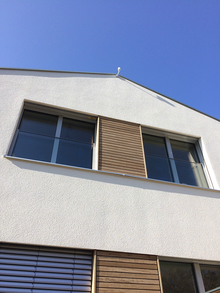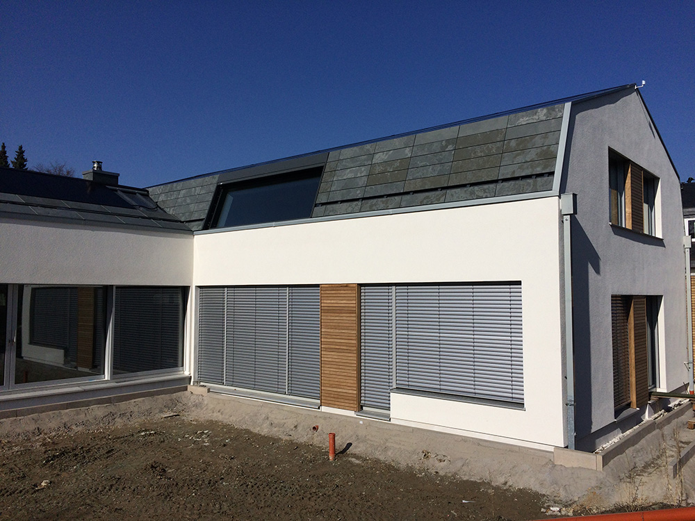 Die gewählte Dachform ermöglicht eine optimale Ausnutzung des Dachgeschosses unter Einhaltung diverser Vorgaben. Die Dachneigung von 20-30 ⁰ bietet zudem sehr günstige Voraussetzungen für die Photovoltaik-Nutzung auf der Südseite. Jenseits dieser funktionalen Rahmenbedingungen lag in der Detailarbeit besonderes Augenmerk auf dem minimalistischen Erscheinungsbild des Daches. Die graugrünen Schieferplatten wurden nach Plan zugeschnitten und nehmen exakt die Fugen der PV-Module auf, die bündig in die Dachfläche integriert sind. Die klare Linienführung zieht sich durch den gesamten Entwurf und verleiht dem Gebäude ein modernes, zeitloses Aussehen.
