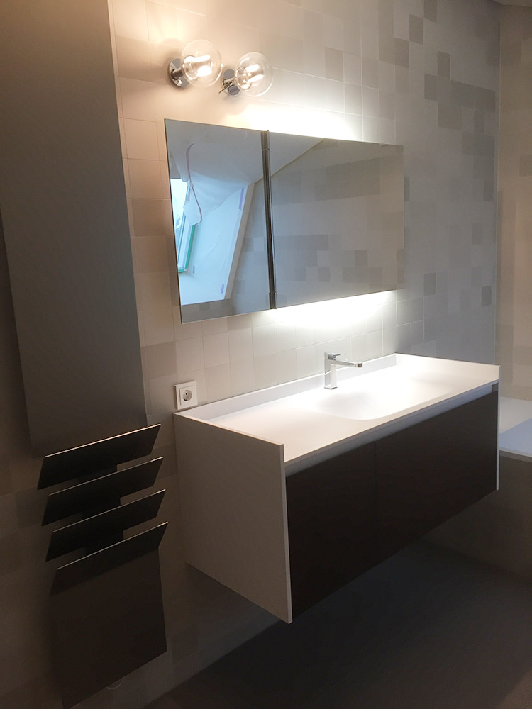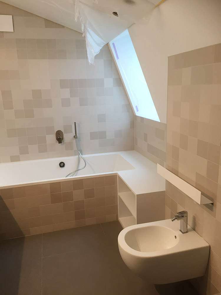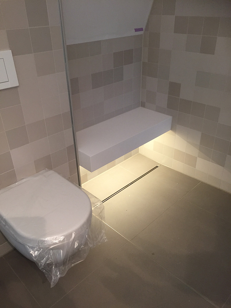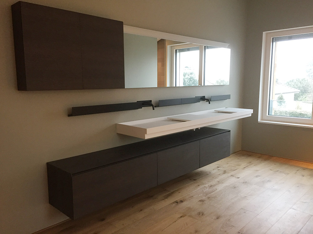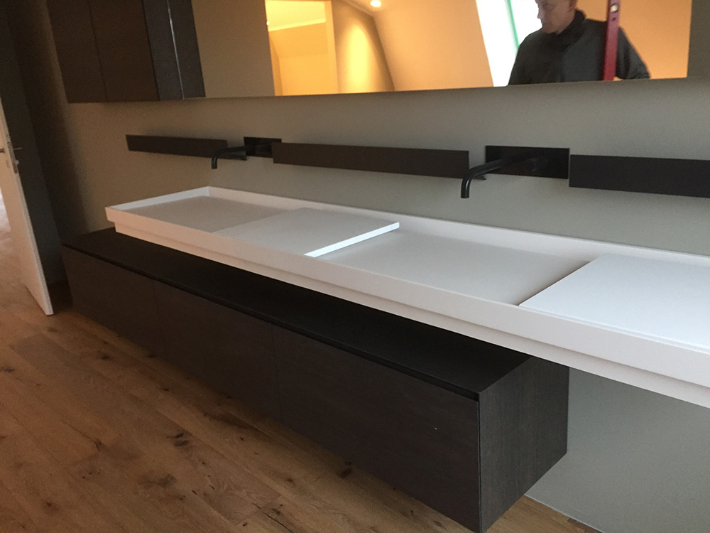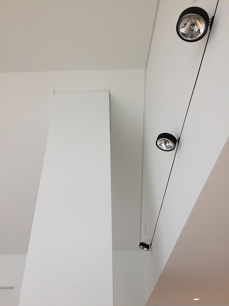 Die gewählte Dachform ermöglicht eine optimale Ausnutzung des Dachgeschosses unter Einhaltung diverser Vorgaben. Die Dachneigung von 20-30 ⁰ bietet zudem sehr günstige Voraussetzungen für die Photovoltaik-Nutzung auf der Südseite. Jenseits dieser funktionalen Rahmenbedingungen lag in der Detailarbeit besonderes Augenmerk auf dem minimalistischen Erscheinungsbild des Daches. Die graugrünen Schieferplatten wurden nach Plan zugeschnitten und nehmen exakt die Fugen der PV-Module auf, die bündig in die Dachfläche integriert sind. Die klare Linienführung zieht sich durch den gesamten Entwurf und verleiht dem Gebäude ein modernes, zeitloses Aussehen.