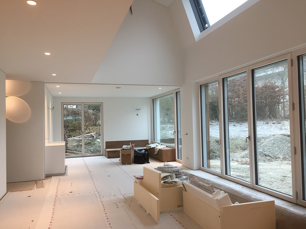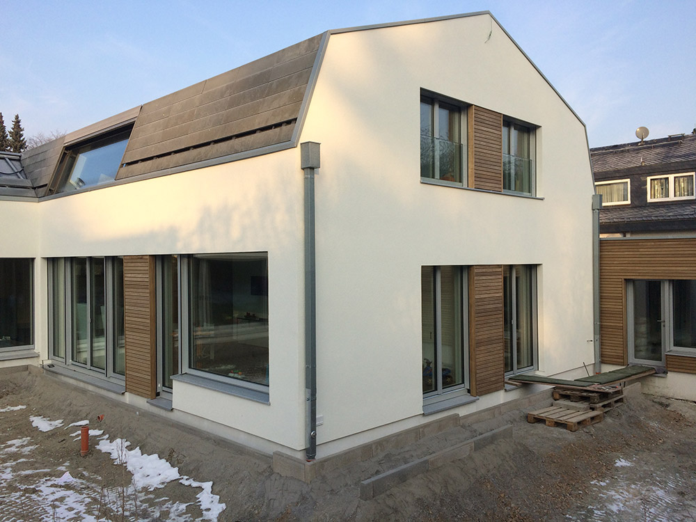 Die Bauherren kamen mit dem Wunsch nach einem Passivhaus in Holzbauweise und einem u-förmigen Entwurf zu uns. Bei näherer Betrachtung stellte sich heraus, dass der vorhandene Entwurf aufgrund von zu großer Hüllfläche und starker Eigenverschattung ungeeignet war, um als Plus-Energie-Haus zu funktionieren. Wesentliche Aspekte wie die günstige Ausrichtung zur Nutzung solarer Gewinne und geringe Wärmeverluste durch kompakte, wärmebrückenfreie Bauweise müssen bereits in der Entwurfsphase bedacht werden. In einem neuen Entwurf wurde der Baukörper so auf dem Grundstück platziert, dass - wie von den Bauherren gewünscht - ein abgeschirmter privater Freibereich entsteht. Die Wohnräume orientieren sich mit großen Öffnungen nach Süden zum eigenen Garten.