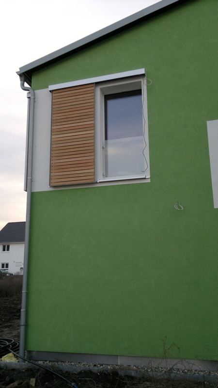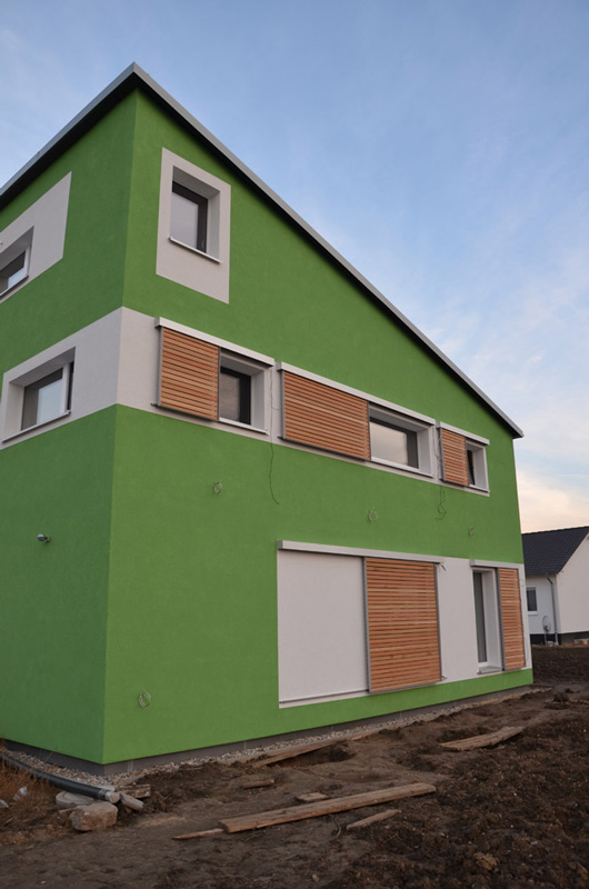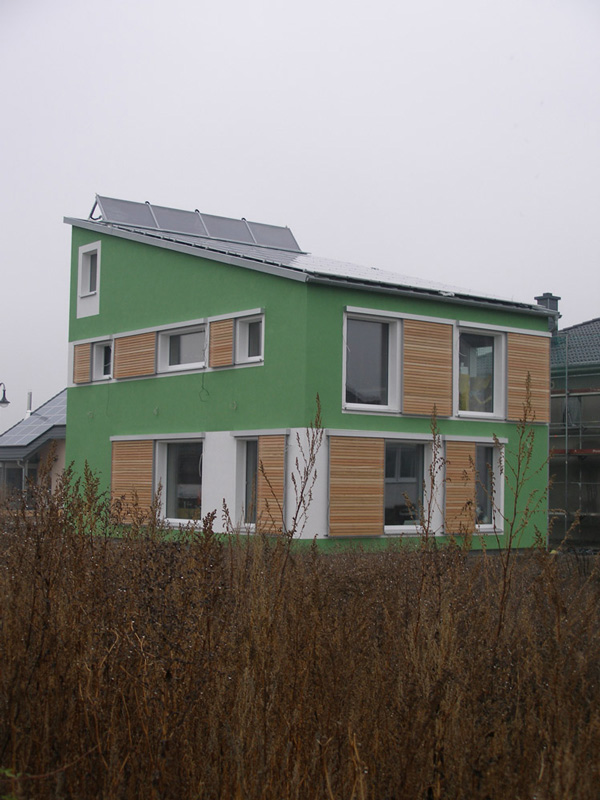 Dieses Plusenergiehaus ist ein qualitätsgeprüftes Passivhaus mit ca. 100m² Photovoltaikanlage und erzeugt mehr Strom als die Nutzer selbst verbrauchen. Weiterhin ist eine thermische Solaranlage installiert, die neben der Wärmepumpe mit Tiefenbohrung den Warmwasser- und den geringen Heizenergiebedarf deckt. Zusätzlich ist dieses ´Smart-Home´ mit Bus- und Netzwerktechnik zeitgemäß ausgestattet. Die Alu-/Holzschiebeläden sind mit einer intelligenten Steuerung dem Sonnenstand nachgeführt, sodass im Sommer verschattet und im Winter mittels auch bei Sonne geöffneten Schiebeläden (Temperaturvergleich) die gewünschte Solarwärme ins Hausinnere gelassen und gehalten wird.