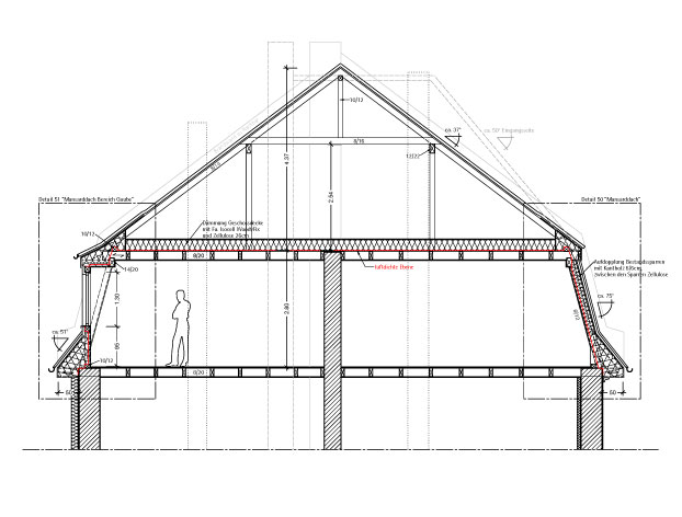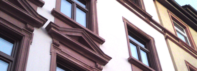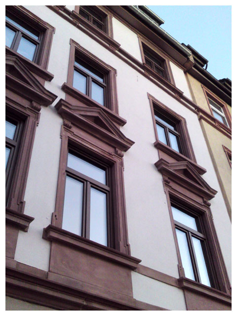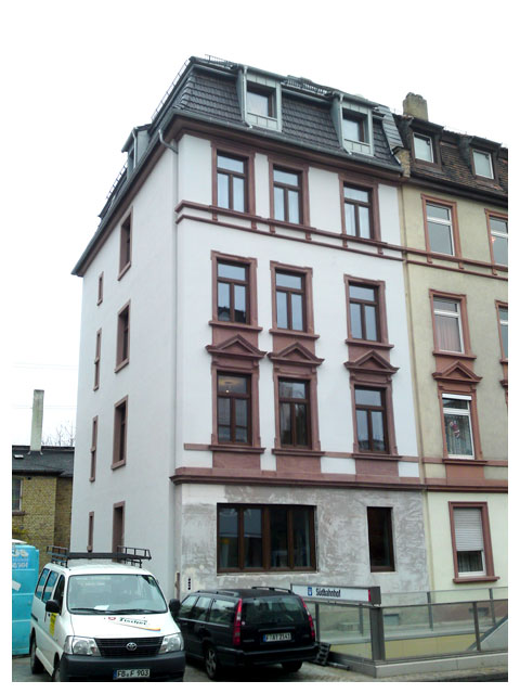 Dieses Gebäude aus der Gründerzeit zu sanieren und einen KfW-Effizienzhausstandard 100 zu erreichen war nur mit der Vorgabe Erhaltung der verzierten Straßenfassade gewünscht. Der Erhalt der Sandsteineinfassungen führte dazu, dass wie bei einem denkmalgeschützten oder als Kulturdenkmal ausgewiesenen Gebäude an der Straßenfassade keine Außendämmung, sondern eine Innendämmung verwendet wurde. Die Mietparteien haben z. T. in der Bauphase im Haus gewohnt. Das Gebäude steht in Frankfurt in Nähe einer vielbefahrenen Bahnstrecke und bietet den Mietern jetzt den Vorteil, dass sich der Schallschutz deutlich verbessert hat. Dies ist durch den Austausch der Fenster und die installierte zentrale Lüftungsanlage mit Wärmerückgewinnung die Räume mit Luft versorgt erreicht worden. Die hof- und giebelseitig angebrachte Dämmung ist so ausgeführt worden, dass die ursprünglichen Proportionen der Gründerzeitfassade erhalten geblieben sind. Eine neue zentrale Heizungsanlage versorgt die Einheiten nach der Sanierung mit nachhaltiger Wärme aus Holzpellets. Der Heizwärmebedarf ist durch die Maßnahmen um 75% reduziert.