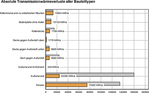 Im Balkendiagramm „absolute Transmissionswärmeverluste der Bauteiltypen“ sehen Sie in hellgrau den derzeitigen Energiebedarf des Gebäudes. In orange ist das Reduktionspotential der Transmissionswärmeverluste nach Umsetzung der vorgeschlagenen Maßnahmen sichtbar.