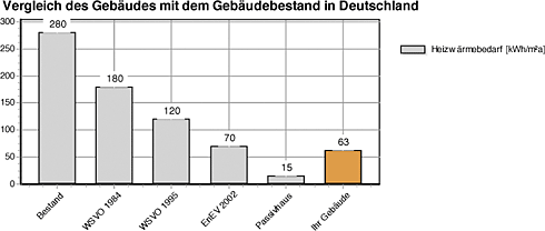 In der Übersicht „Vergleich des Gebäudes mit Gebäudebestand in Deutschland“ wird das erreichbare Ziel nach Sanierung dargestellt wobei der EnEV-Neubaustandard oder besser erreicht wird.